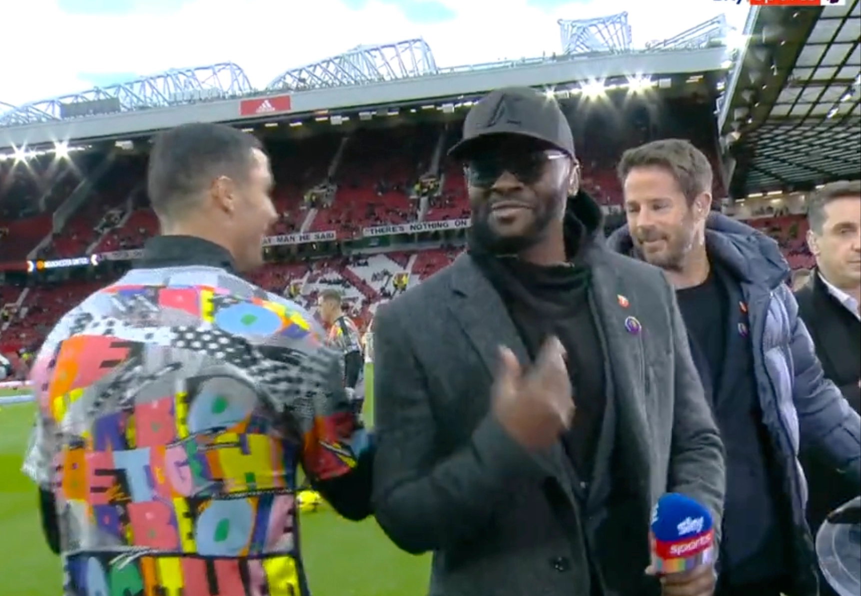 Saat itu, terdapat dua legenda Man United, yaitu Gary Neville dan Louis Saha. Selain eks MU, ada juga legenda Tottenham Hotspur, Jamie Redknapp. Cristiano Ronaldo lantas menghampiri mereka untuk sekadar bersalaman dengan rekan lamanya.