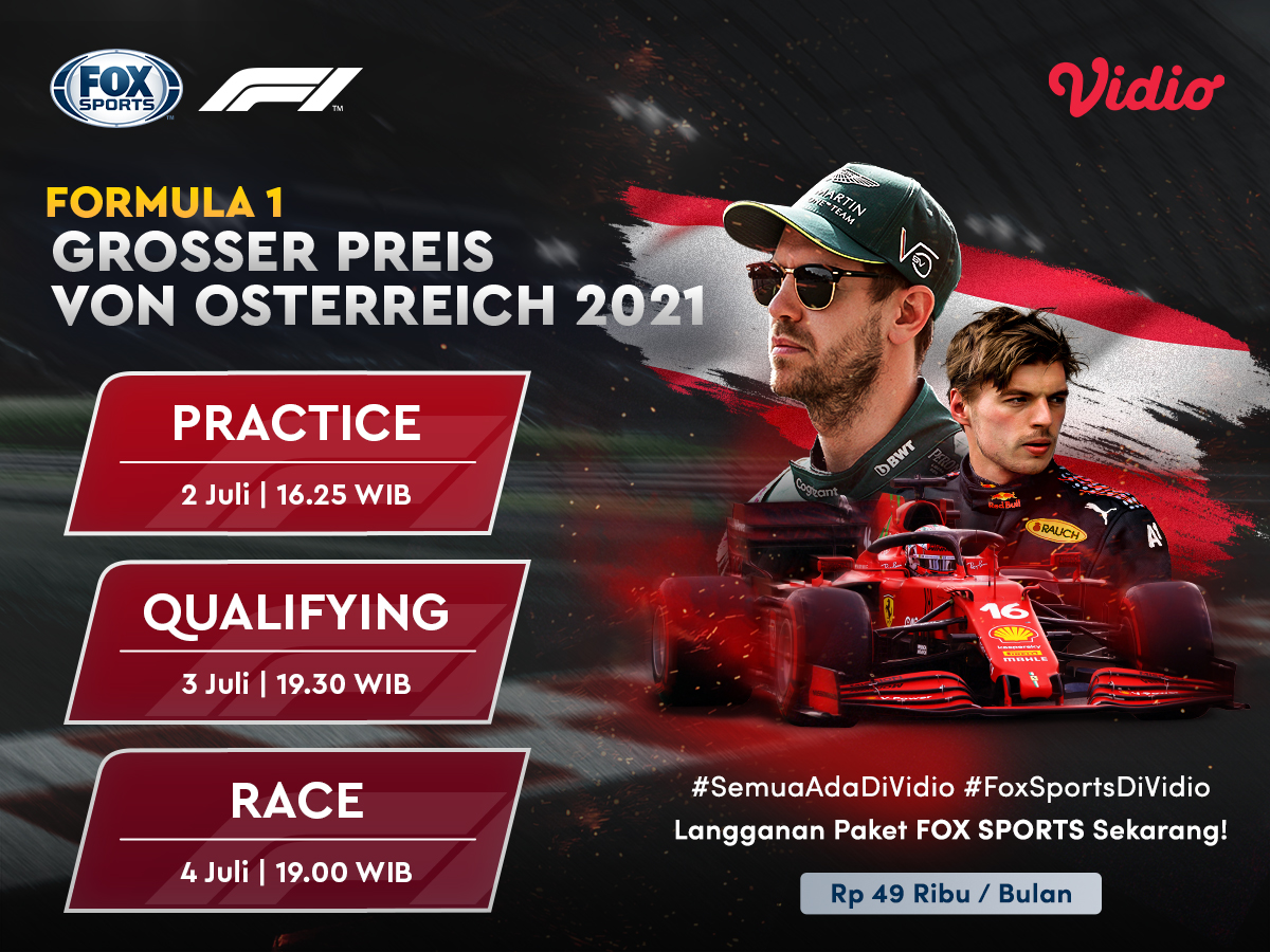 Live streaming Formula 1 Grand Prix Austria 2021 akan berlangsung pekan ini, Jumat-Minggu (2-4/7) eksklusif di Vidio. Balapan seri kesembilan ini akan dihelat di kandang Red Bull Racing, Sirkuit Red Bull Ring, Austria.