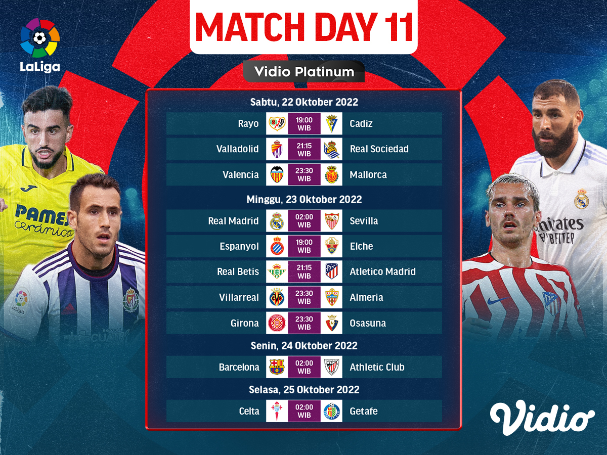 Adapun live streaming La Liga 2022/23 pekan 11 dapat disaksikan melalui Vidio. Segera download aplikasinya sekarang juga dan beralih ke Vidio Premier Platinum agar dapat menyaksikan keseruan seluruh pertandingannya. Selamat menonton! #SemuaAdaDiVidio