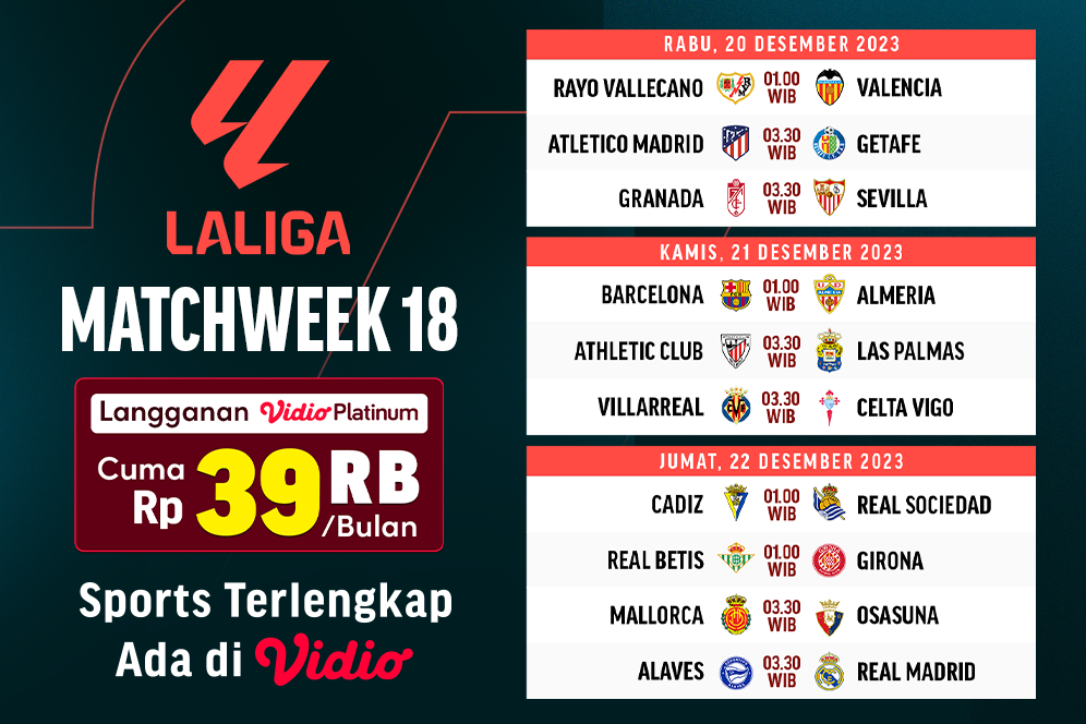 Simak jadwal dan link streaming LaLiga Spanyol 23/24 matchweek 18 yang akan berlangsung pada 20 hingga 22 Desember 2023. Saksikan pertandingannya melalui streaming Vidio!