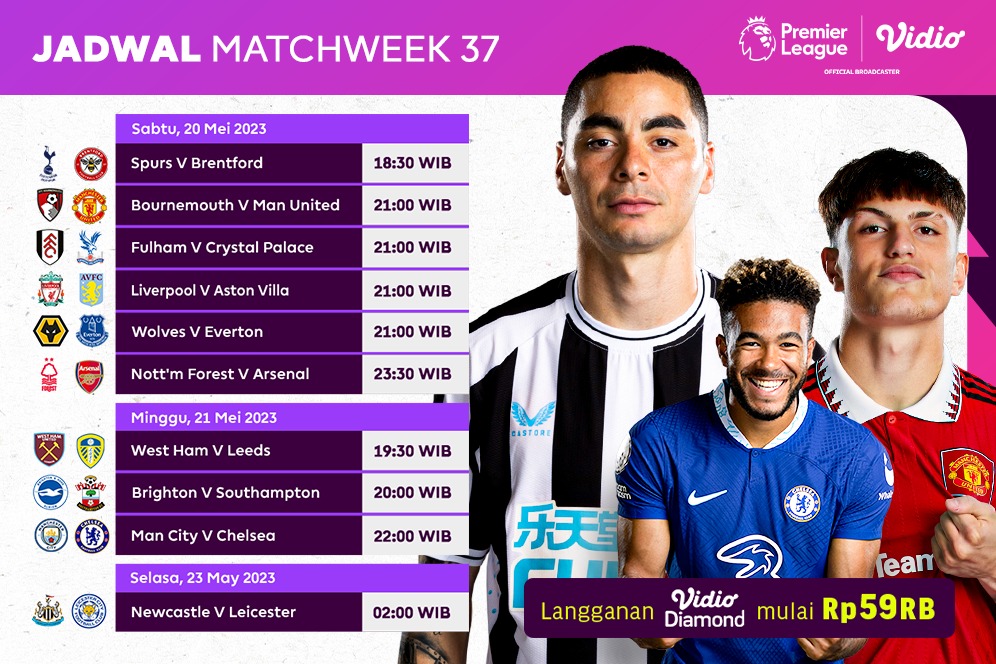 Jadwal live streaming Liga Inggris matchweek 37 yang akan berlangsung dan disiarkan eksklusif melalui Vidio.