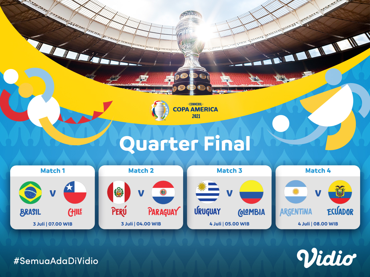 Jadwal perempat final Copa America 2021 akan berlangsung pada akhir pekan ini, Sabtu & Minggu (3-4/7) Eksklusif di Vidio. Turnamen sepak bola terbesar benua Amerika Selatan ini, tinggal menyisakan 8 negara yang akan siap saling adu strategi demi merebutkan tiket ke semifinal.