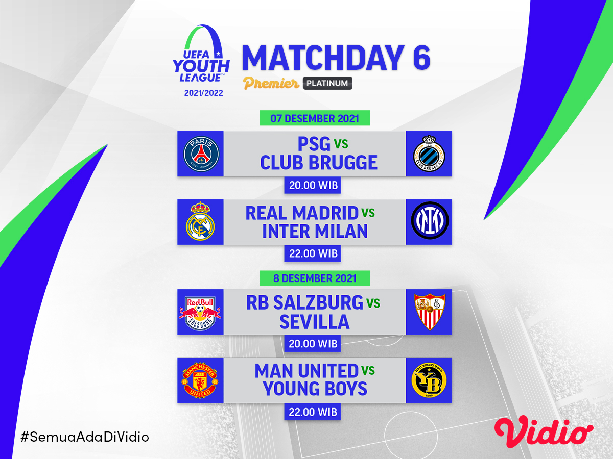 Live streaming UYL atau UEFA Youth League 2021 kini memasuki pekan keenam yang akan berlangsung pada hari ini, Selasa & Rabu 7-8 Desember 2021 nanti. Beberapa pertandingan Liga Pemuda di Eropa ini akan tayang dan dapat disaksikan melalui Vidio.