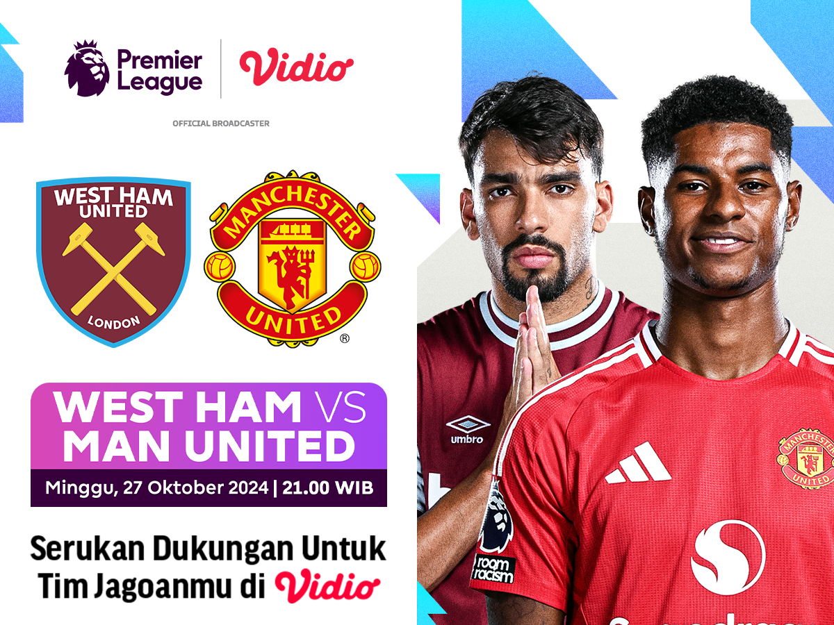 Siaran langsung West Ham vs Manchester United akan segera berlangsung pada Minggu (27/10/2024) pukul 21.00 WIB dan akan disiarkan melalui layanan OTT Vidio.