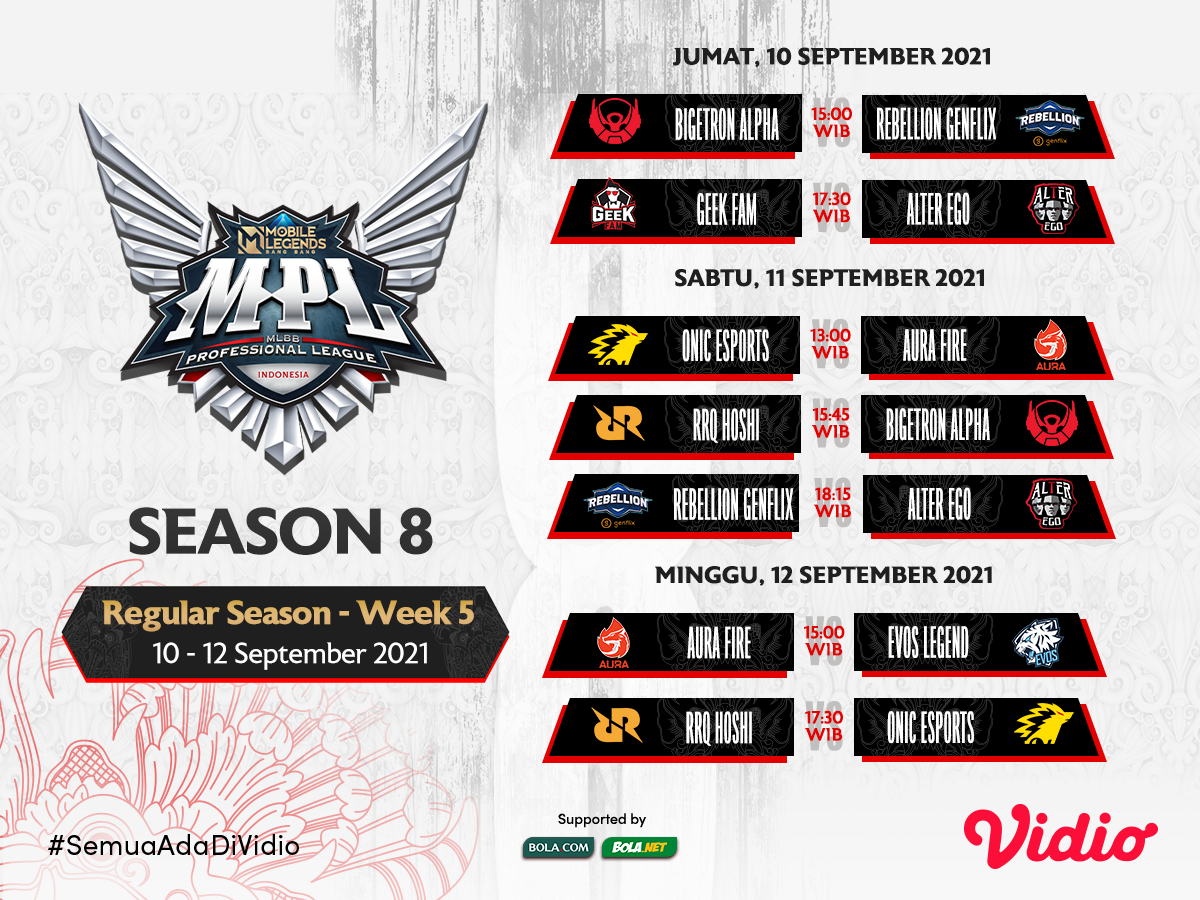 Live streaming MPL ID S8 (Season 8) week 5 akan berlangsung mulai hari ini, Jumat-Minggu 10-12 September 2021 mendatang. Duel kompetisi utama Mobile Legends di Indonesia ini siaran langsungnya dapat disaksikan eksklusif melalui Vidio.