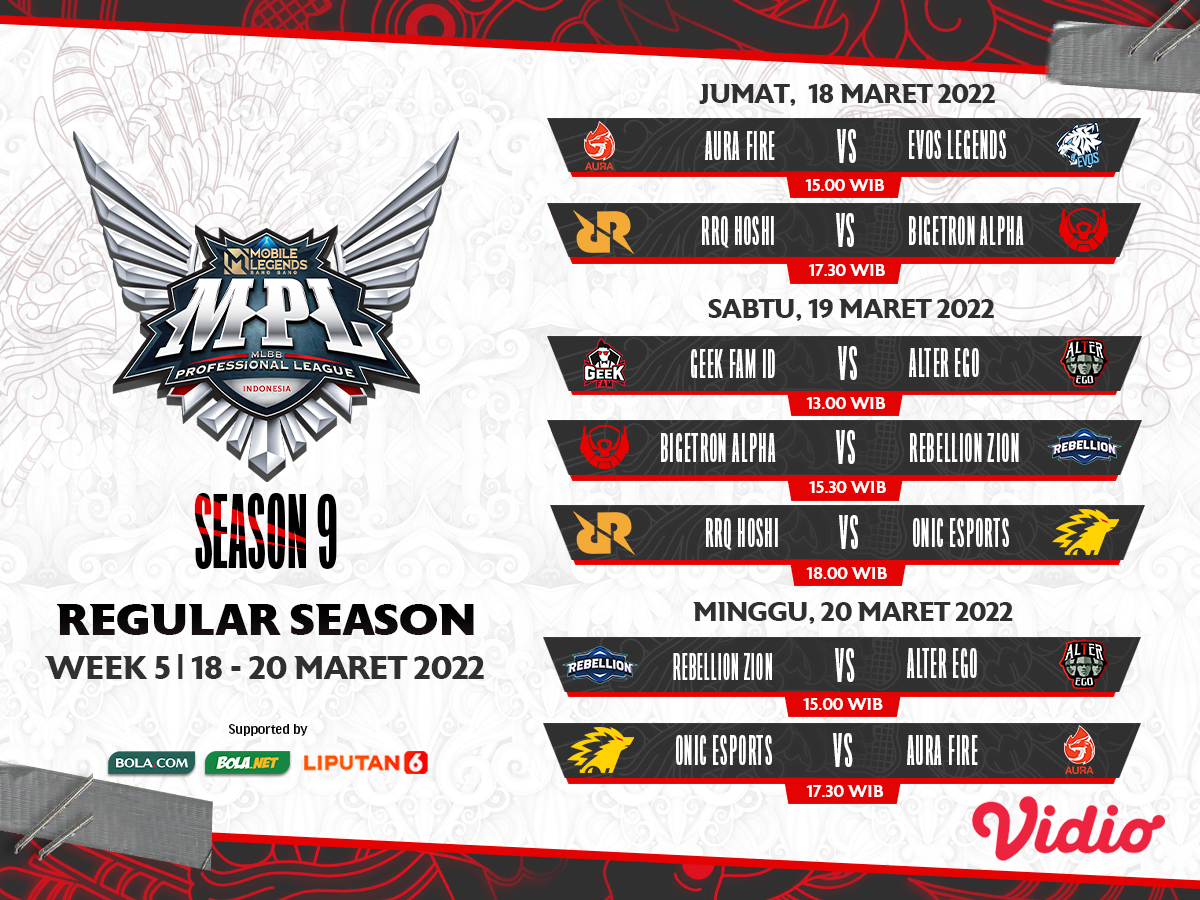 Berikut jadwal lengkap MPL Season 9 pekan kelima yang akan tayang seluruh pertandingannya dan dapat disaksikan GRATIS melalui Vidio!