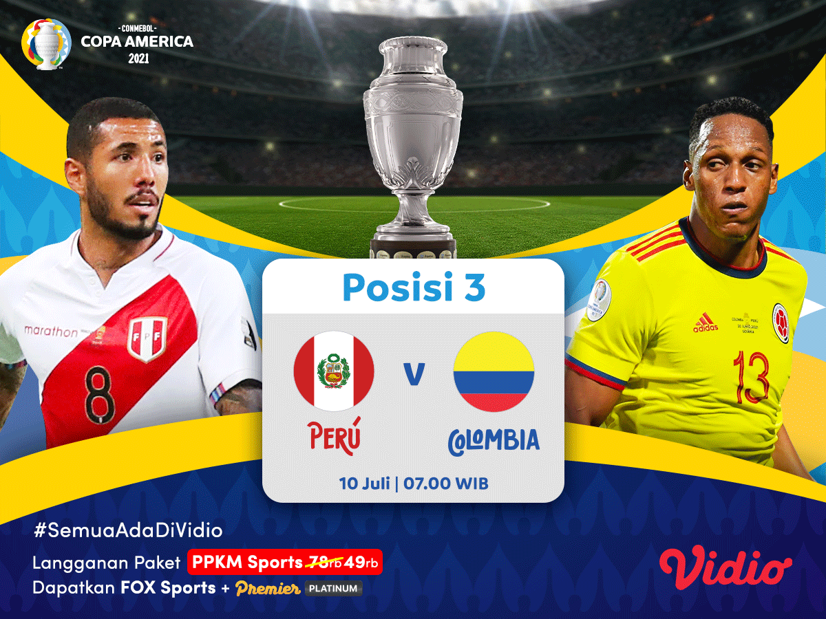 Live streaming perebutan juara 3 Copa America 2021 antara Peru vs Kolombia akan berlangsung besok pagi, Sabtu (10/7) WIB eksklusif di Vidio. Pertandingan ini akan dihelat di Estadio Nacional de Brasilia Mané Garrincha.