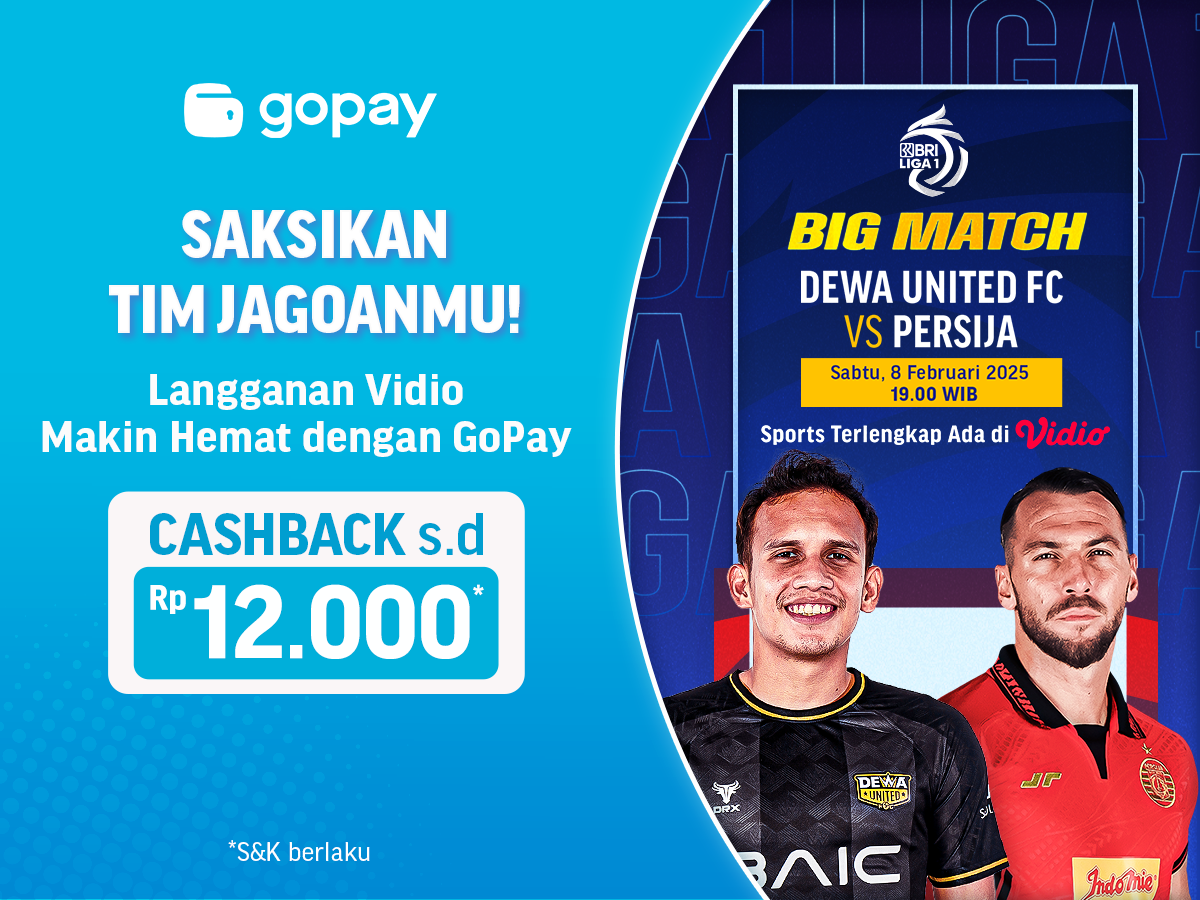 Jangan tunda lagi kesempatan untuk menikmati hiburan premium dengan lebih hemat! Dapatkan cashback menarik dari Vidio dan GoPay di bulan Februari 2025, nikmati pertandingan seru seperti Dewa United FC vs Persija, serta berbagai tayangan favorit lainnya. Pastikan kamu tidak ketinggalan promo ini, karena kuotanya terbatas setiap harinya. Segera langganan Vidio Platinum, bayar pakai GoPay, dan rasakan serunya nonton tanpa batas!