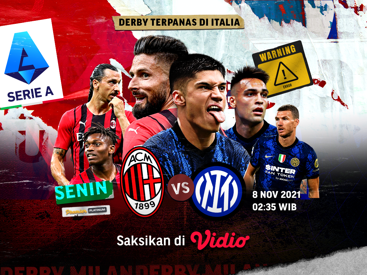 Live streaming Serie A Italia musim 2021/22 giornata 12 menyajikan duel panas yang bertajuk Derby della Madonnina antara AC Milan vs Inter Milan yang akan berlangsung besok, Senin 8 November 2021 di Stadion San Siro dan dapat disaksikan melalui Vidio.
