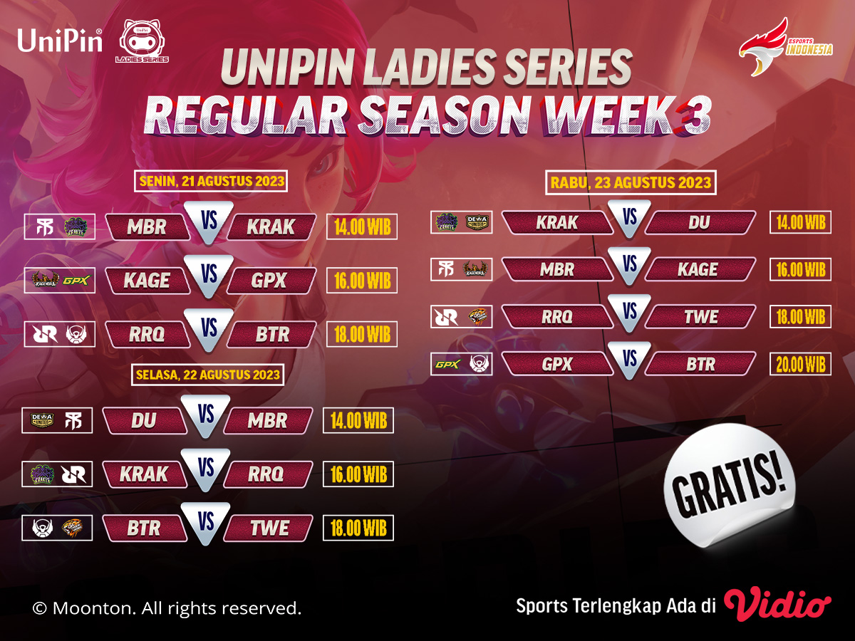 UniPin Ladies Series Season 3 telah memasuki minggu ketiga, dan persaingan semakin ketat. Delapan tim terbaik di Indonesia masih bersaing untuk menjadi yang terbaik, dan setiap pertandingannya selalu seru untuk ditonton.